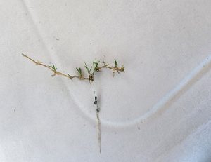 We’ve talked before about sprigs but wanted to share a great example I found the other day. In the picture, you can clearly see a stolon that has begun to regrow. Stolons are the above-ground shoots of Bermuda grass that spread very quickly. A couple of new roots have formed and have started producing new leaves at each node.